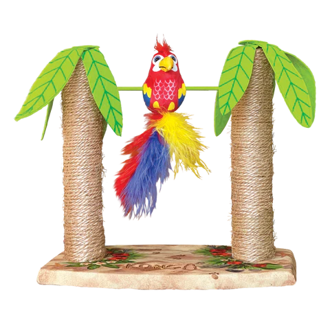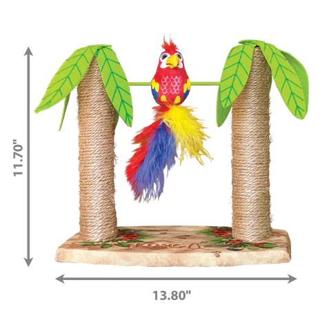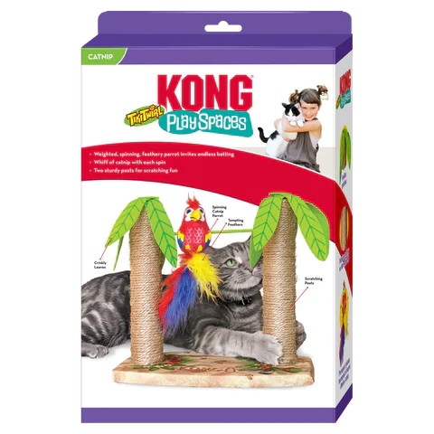 KONG Play Spaces Tiki Twirl welcomes cats to castaway onto a paradise playground of instinct-satisfying enrichment. The weighted parrot’s feathered tail and spinning action keep kitties batting a rainbow swirl of fun—packed with KONG North American Premium Catnip to prolong play. Two sturdy palm tree posts, topped with intriguingly crinkly leaves are made for scratching bliss. Bikini not included.