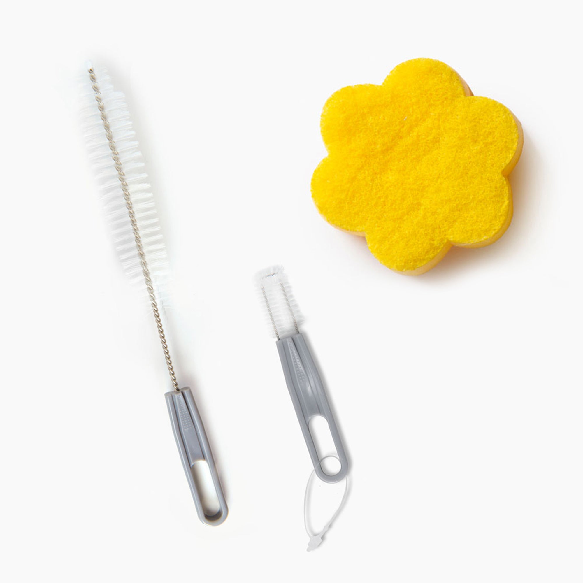 The set contains a hard bristle brush with fine tip for accessing small areas and a flower-shaped cleaning sponge with dual textures and wavy surface.