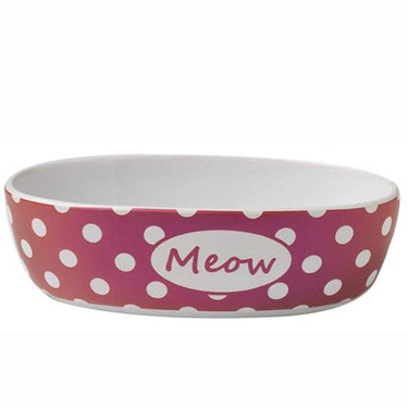 Gift your kitty this colorful PetRageous Designs Bedazzled "Meow" Bowl. With its pink color, polka dots, shinny finish and "Meow" written out, this bowl will become her favorite. - In its stoneware construction this bowl is dishwasher and microwave safe - Made of hand crafted, 100% stoneware - 4”L x 6.5"W x 2"h - Shimmer finish