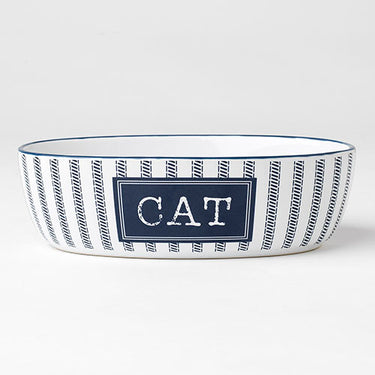 Country Blue, oval CAT bowl in White/Navy has a 2 cups capacity. It features vertical, stitched striping in Navy spaced evenly around the exterior of the bowl. In the center of the exterior of the bowl there is navy-colored patch logo with the word “CAT” scripted inside.