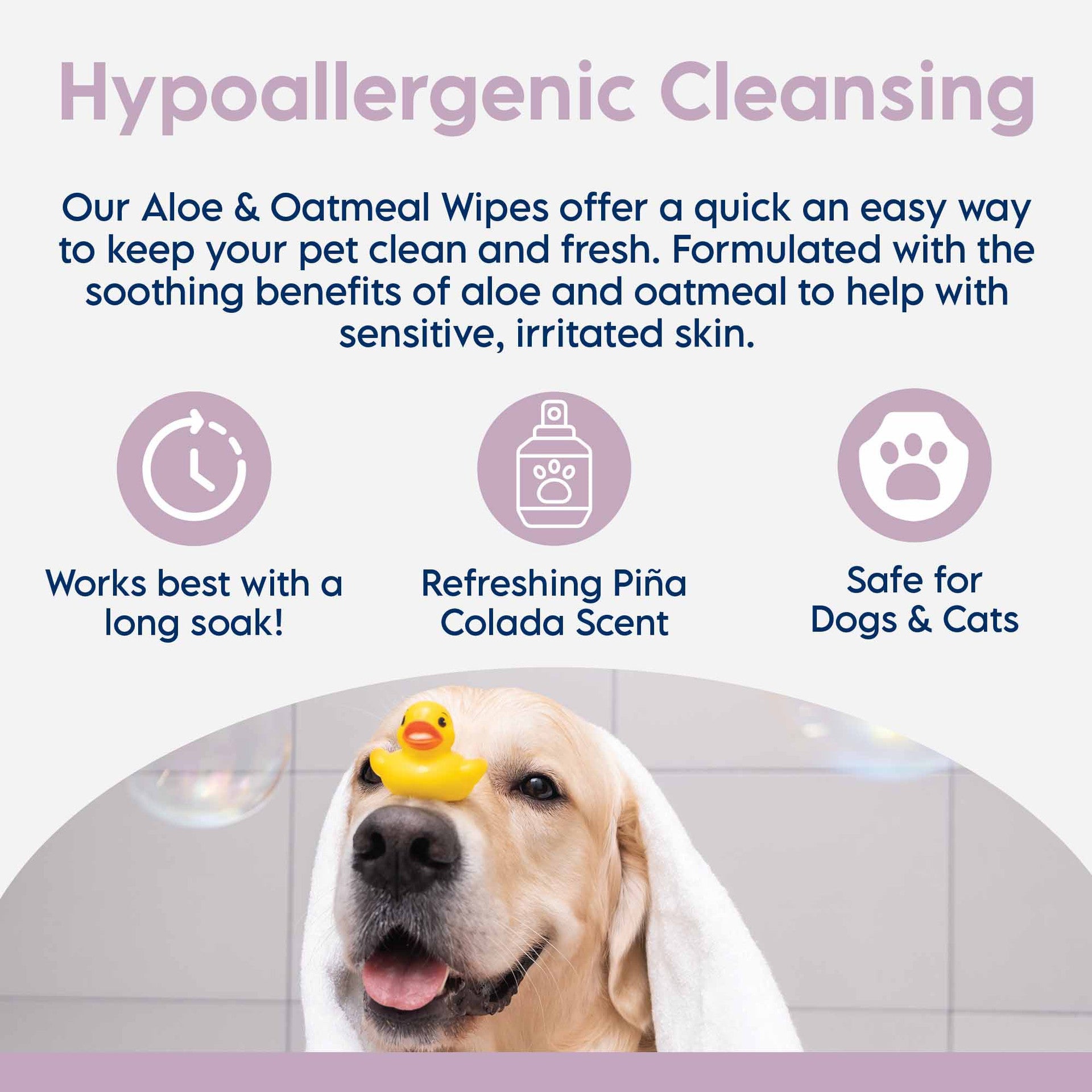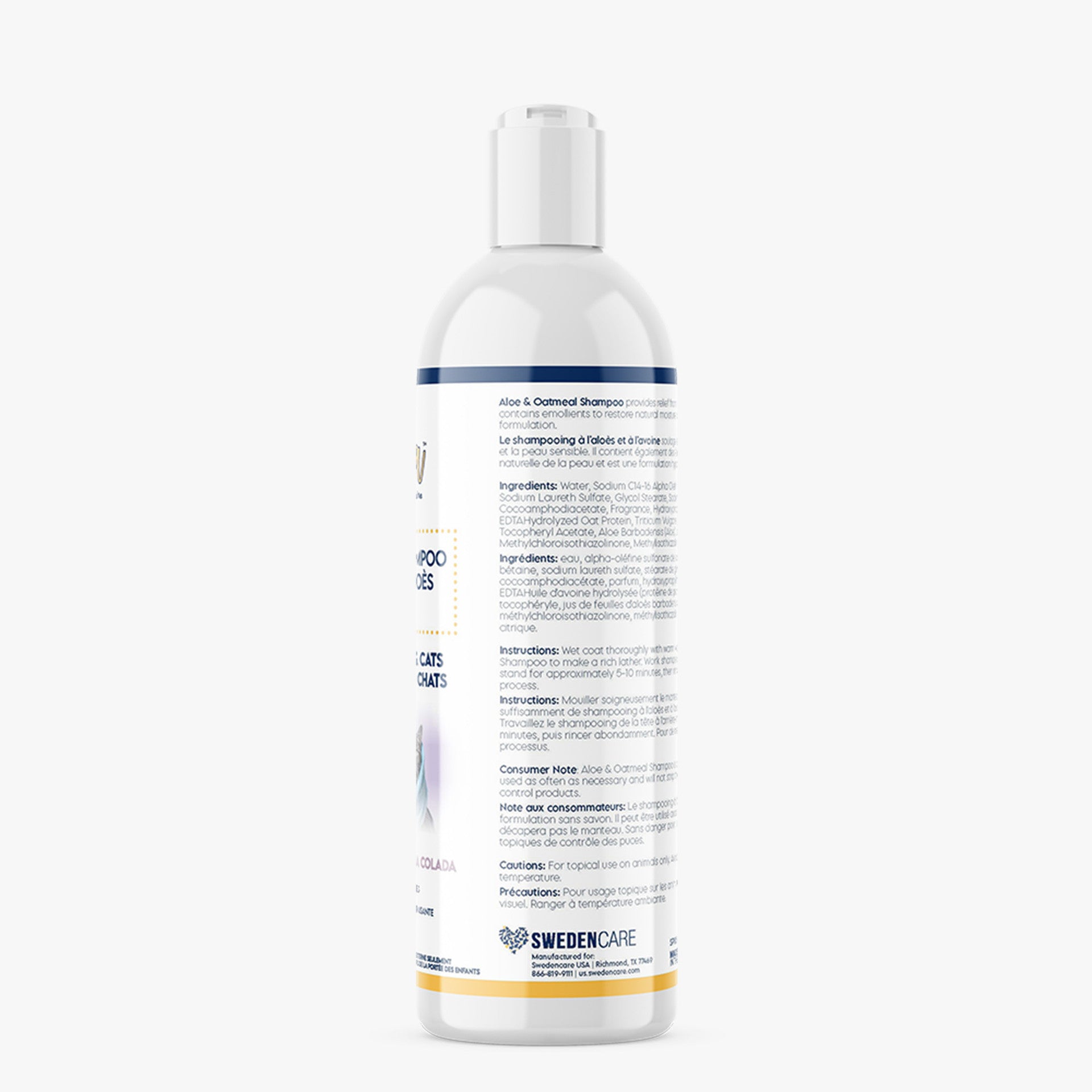 Wet coat thoroughly with warm water. Apply enough Aloe & Oatmeal Shampoo to make a rich lather. Work shampoo from head to hindquarters. Let stand for approximately 5-10 minutes, then rinse thoroughly. For best results, repeat the process.