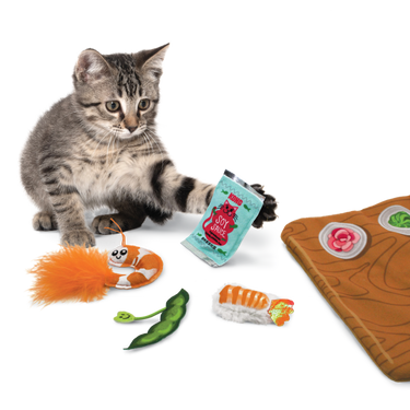KONG Pull-A-Partz Sushi’s 5-toys-in-1 deliver an endless feast of multi-sensory fun based on a crinkly sushi board that invites healthy wrestling. Pulling edamame, shrimp and soy sauce from hook-and-closure patches satisfies dismantling instincts while each lightweight, bat-table toy inspires play with KONG Premium North American Catnip inside, extending the action.