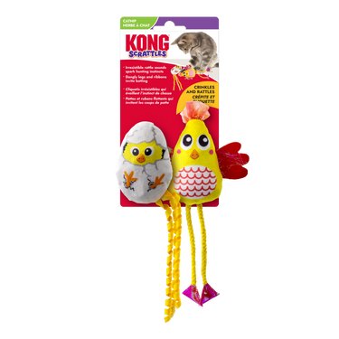 KONG Scrattles duos bring crinkly, dangling, and rattling fun to feline playtime! These multisensory combo toys spark hunting instincts for batting, biting, and drag-and-capture action for healthy, full-body play. KONG Premium North American Catnip inside the two lightweight plush toys prolongs play.