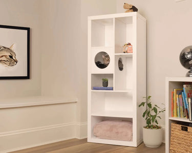 A compact sized bookshelf with a safe and playful environment for your furry friend. A sleek, slim design loved by humans for it's stylish storage and by pets for it's climbing and hiding abilities. 7 levels of shelving allow your cat to climb, play and hide with mounting brackets to keep securely mounted to your wall.