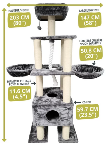 Everything is oversized on this cat tree : posts, spoons, bed, house condo, rope, the base, weight of the tree.