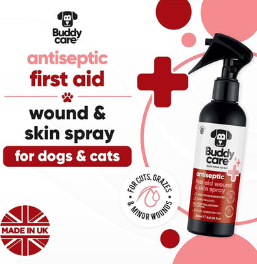Buddycare Antiseptic First Aid Wound and Skin Spray for Dogs is the perfect solution for treating minor cuts, scrapes, abrasions, and skin irritations. Formulated with your pet's safety and comfort in mind, this gentle yet effective spray helps to cleanse and protect wounds, promoting faster healing and preventing infection.