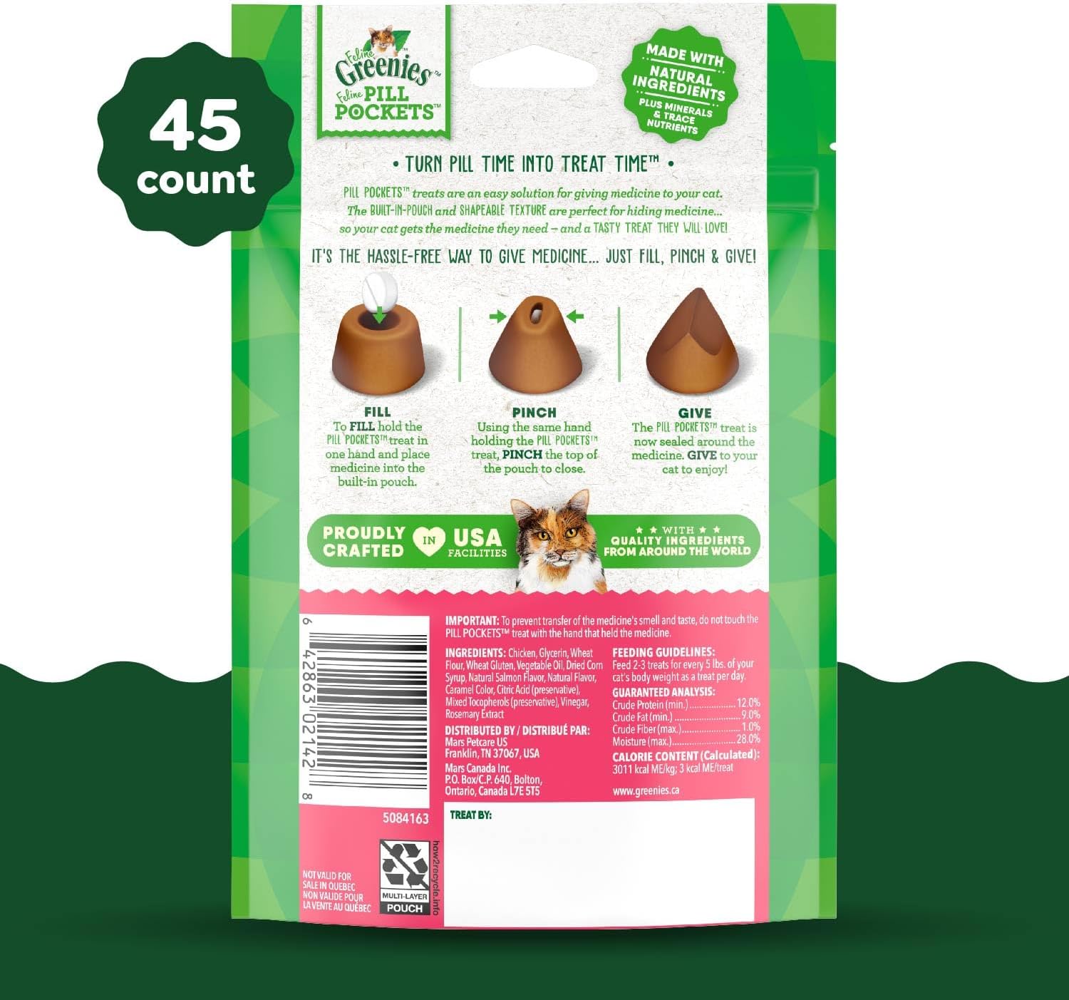 These all-natural treats are designed to make medication time hassle free! The built pouch makes it easy to hide pills or liquid medication. The Pill Pockets are a healthy alternative to hiding pills in human foods because they have fewer calories and are low in fat and sodium. Make pill-giving more enjoyable for both you and your cat with a treat made from real chicken and salmon proteins.