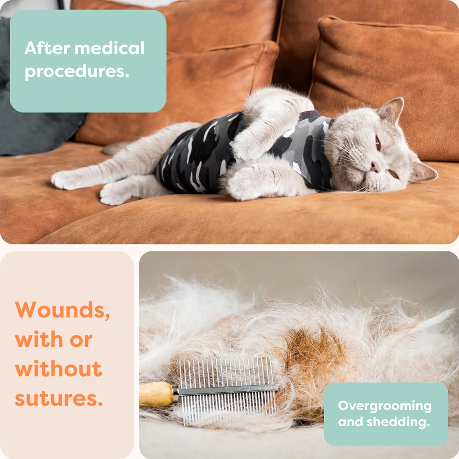 Say goodbye to loose pet hair floating around your home! Cats shed the most around their torso and that’s exactly the area the Recovery Suit covers. Loose hairs are easily trapped inside the suit, so all you have to do is take it off, clean it, and you're done. A smart solution for keeping your home clean, even during shedding season!