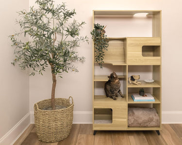 A multifunctional storage book shelf, with climbable shelves and human storage. The Clifford is a sleek bookshelf to keep your cat entertained, while providing storage for your everyday needs. Suitable for play time, nap time or keeping an eye on humans from above! Specs Dimensions: 36″ x 15″ x 68.75″ Material: Engineered wood, metal feet