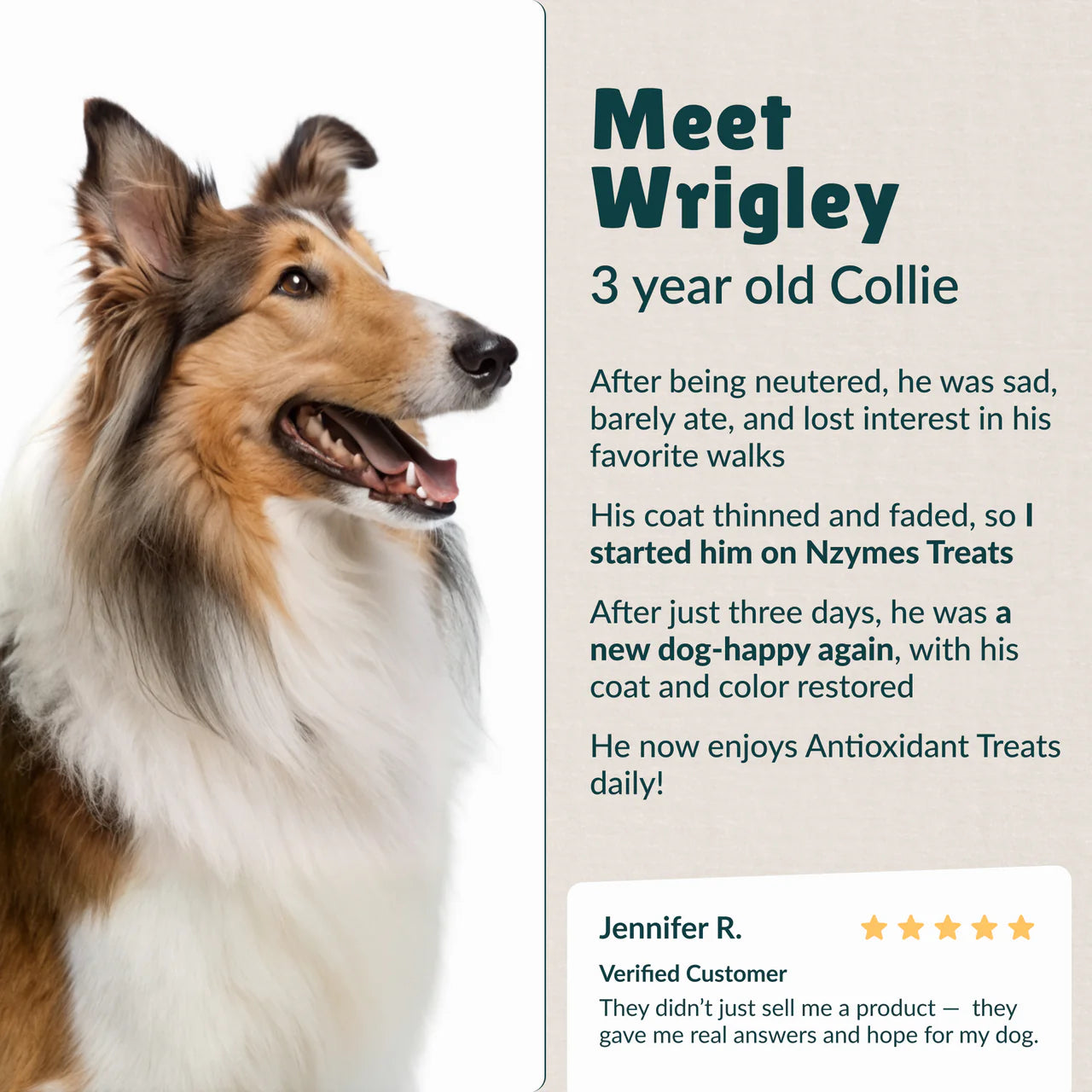 Superfood protein paired with natural enzymes to support foundational health. Made with the same live-sprouted base as our Granules, Antioxidant Treats offer added nutrients in a tasty chew your dog will look forward to every day.