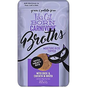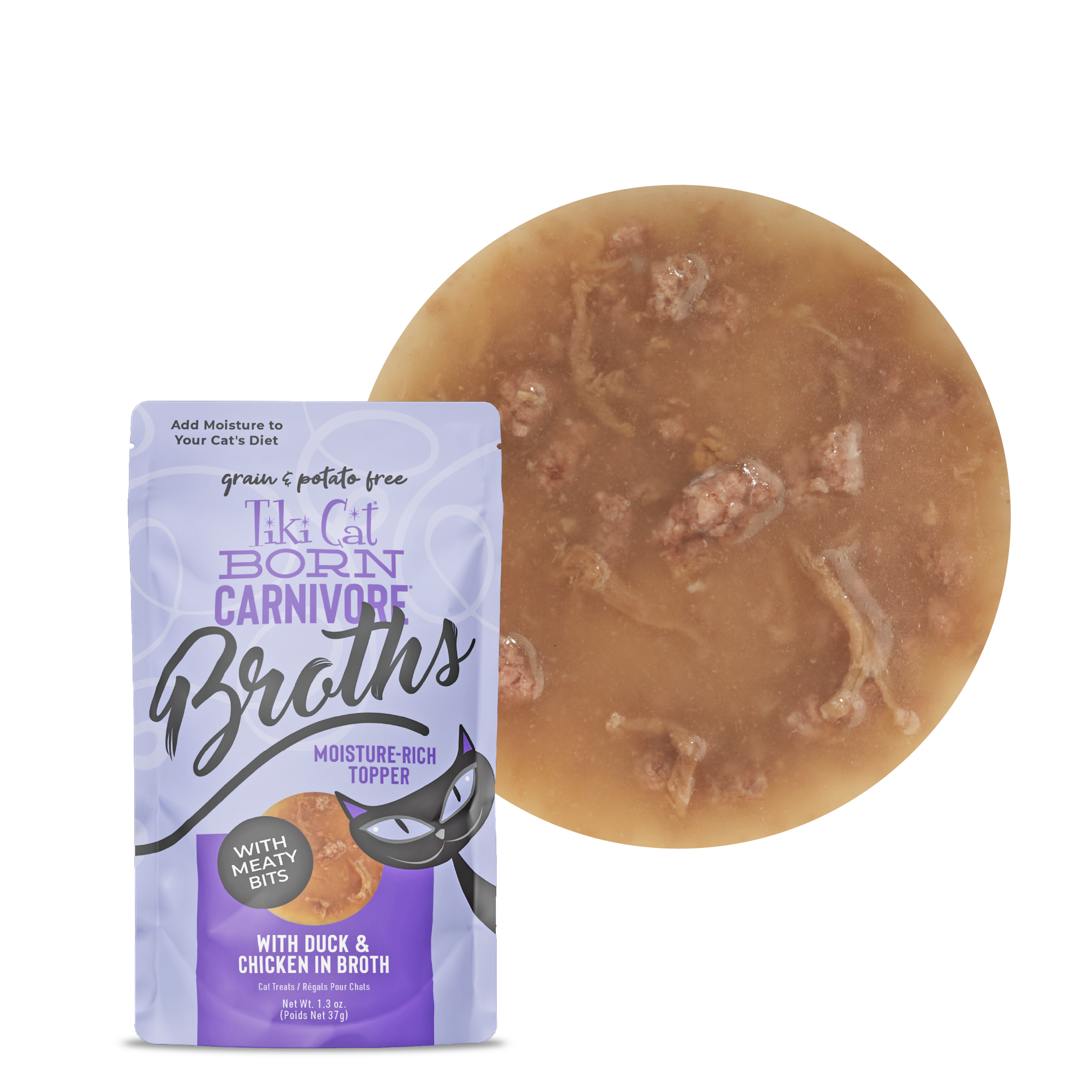Cats crave - and require - added moisture in their diets. Each perfectly portioned Tiki Cat® Born Carnivore savory duck and chicken broth with meaty bites single-serve pouch can transform your cat's typical meal with a dose of flavor, or let them lap it up alone as a special treat. Made with real ingredients that cats need and nothing they don't.