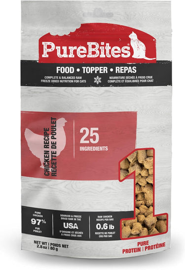 Go ahead, turn the bag around and look at our ingredients. PureBites® Chicken Recipe RAW Freeze Dried Complete & Balanced cat food or topper is made with 25 Human Grade Ingredients. Made with 97% Human Grade Chicken & 3% Human Grade Essential Vitamins, Minerals & Natural Preservatives. PureBites® Chicken Recipe can be fed as a 100% complete & balanced cat food or as a mixer/ topper for an added RAW protein boost. Cats love the taste of PureBites® because our food is delicately freeze dried RAW to lock in & the aroma, texture and freshness they crave. Cat parents love PureBites® because our food or topper is rich in nutrients for a happy and healthy life.