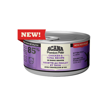 ACANA PREMIUM PÂTÉ™ Chicken & Tuna Recipe in Bone Broth Kitten Food is formulated to meet the nutritional levels established by the AAFCO Cat Food Nutrient Profiles for growth.