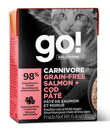 GO! CARNIVORE Grain Free Salmon + Cod Pâté is formulated to meet the nutritional levels established by the AAFCO Cat Food Nutrient Profiles for All Life Stages.
