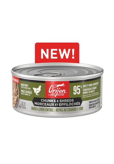 Nourish your cat completely with hearty WholePrey animal ingredients and real shreds of meat, poultry or fish in ORIJEN™ Chunks & Shreds Wet Cat Food! Cats are obligate carnivores, so they thrive off a diet packed with animal ingredients. That’s why our Duck & Liver Entrée recipe includes a whopping 95% animal ingredients1 to provide your cat with the Biologically Appropriate nourishment they were born to eat. This diet also includes succulent WholePrey ingredients like chicken liver to provide your cat with rich and varied nutrients. Bone broth helps support your cat’s hydration, while also adding tempting flavour. Nourish your cat with the texture and variety of raw animal ingredients packed into every can of ORIJEN™ Chunks & Shreds.