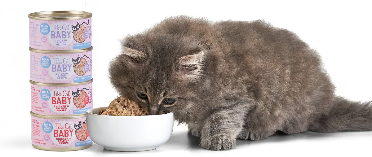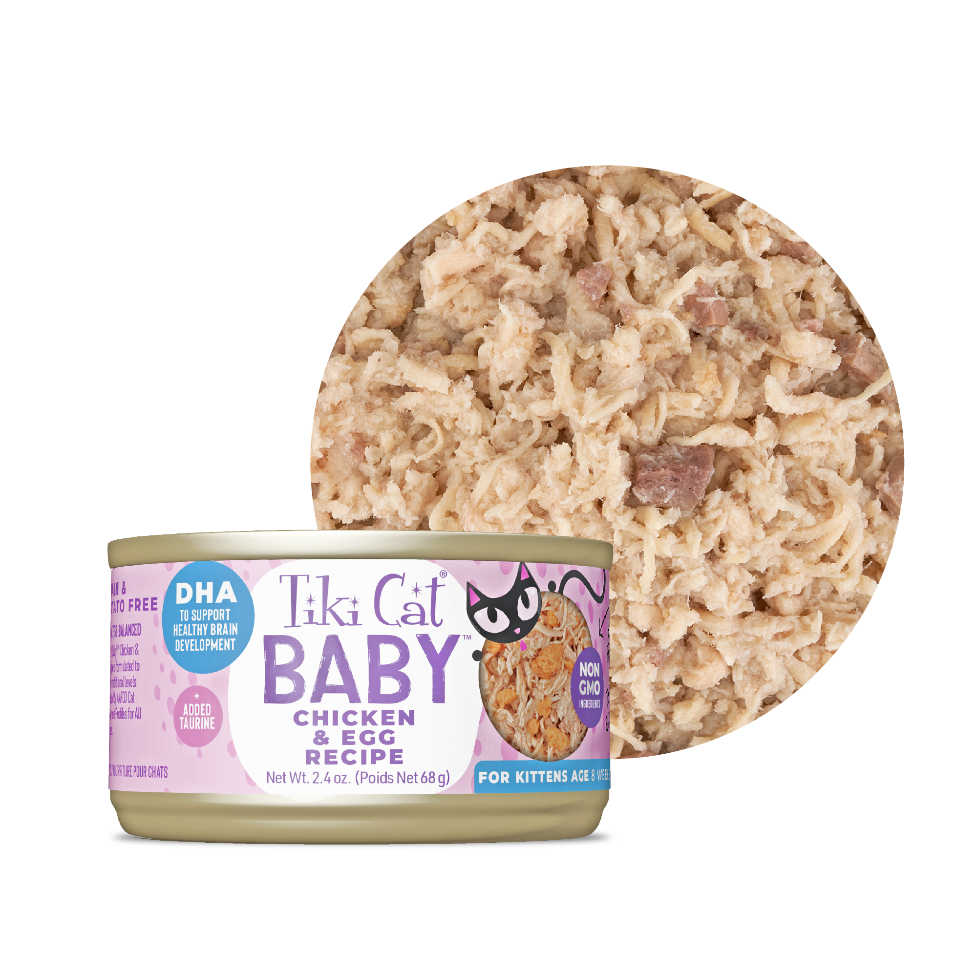 Kittens are born carnivores, but they also have very specific nutritional needs. With increasing energy, developing digestive and immune systems, and growing bodies, they need nutrition designed just for them. Tiki Cat Baby Chicken & Egg Recipe gives kittens their best start, with high protein and fat to support early growth and DHA to promote healthy brain development, in a soft, flavorful formula.