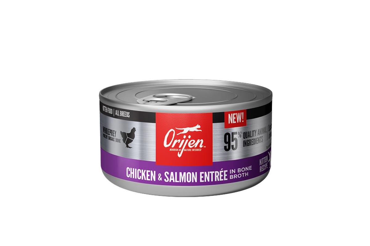 ORIJEN® Chicken & Salmon Entrée in Bone Broth Kitten Food is formulated to meet the nutritional levels established by the AAFCO Cat Food Nutrient Profiles for growth.