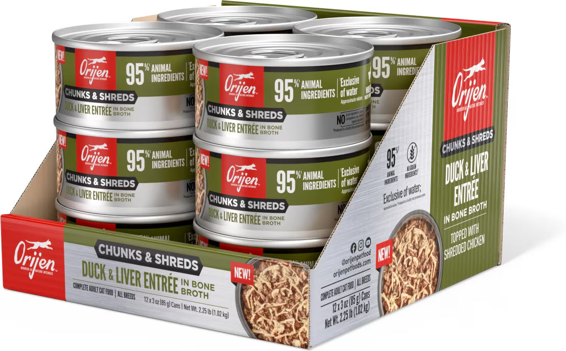 ORIJEN Chunks & Shreds Duck & Liver Entrée in Bone Broth Complete Adult Cat Food is formulated to meet the nutritional levels established by the AAFCO Cat Food Nutrient Profiles for maintenance.