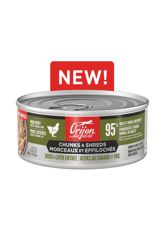 Nourish your cat completely with hearty WholePrey animal ingredients and real shreds of meat, poultry or fish in ORIJEN™ Chunks & Shreds Wet Cat Food! Cats are obligate carnivores, so they thrive off a diet packed with animal ingredients. That’s why our Duck & Liver Entrée recipe includes a whopping 95% animal ingredients1 to provide your cat with the Biologically Appropriate nourishment they were born to eat. This diet also includes succulent WholePrey ingredients like chicken liver to provide your cat with rich and varied nutrients. Bone broth helps support your cat’s hydration, while also adding tempting flavour. Nourish your cat with the texture and variety of raw animal ingredients packed into every can of ORIJEN™ Chunks & Shreds.