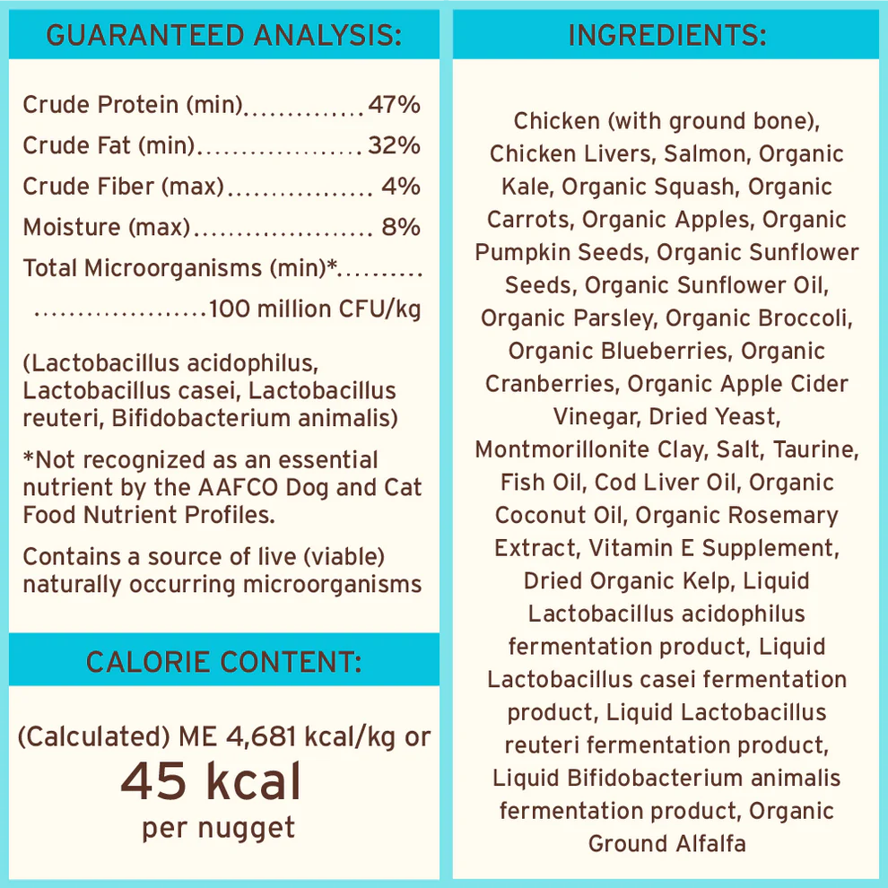 Chicken (with ground bone), Chicken Livers, Salmon, Organic Kale, Organic Squash, Organic Carrots, Organic Apples, Organic Pumpkin Seeds, Organic Sunflower Seeds, Organic Parsley, Organic Broccoli, Organic Blueberries, Organic Cranberries, Organic Apple Cider Vinegar, Dried Yeast, Montmorillonite Clay, Salt, Taurine, Fish Oil, Cod Liver Oil, Organic Coconut Oil, Vitamin E Supplement, Dried Organic Kelp, Organic Ground Alfalfa.